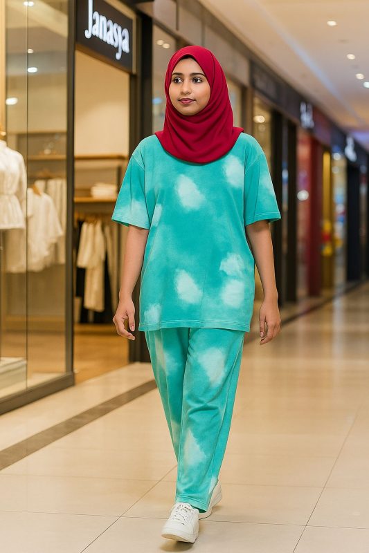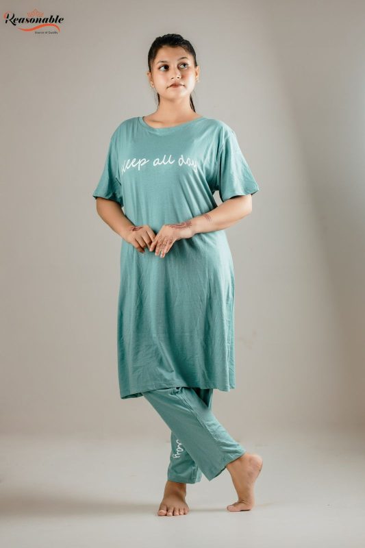 Women’s Premium Drop shoulder T-shirt & pajama Set 2Pcs-Greenish Blue