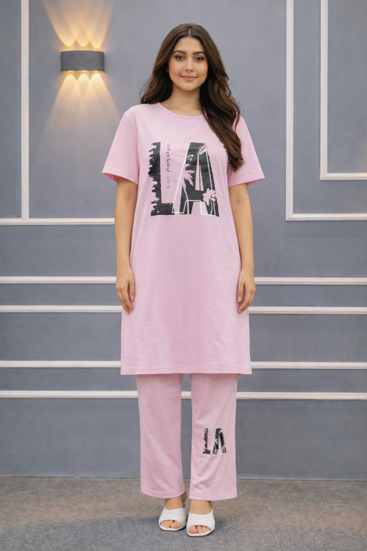 Women’s Premium Long T-shirt & pajama Set 2pc-Light Pink