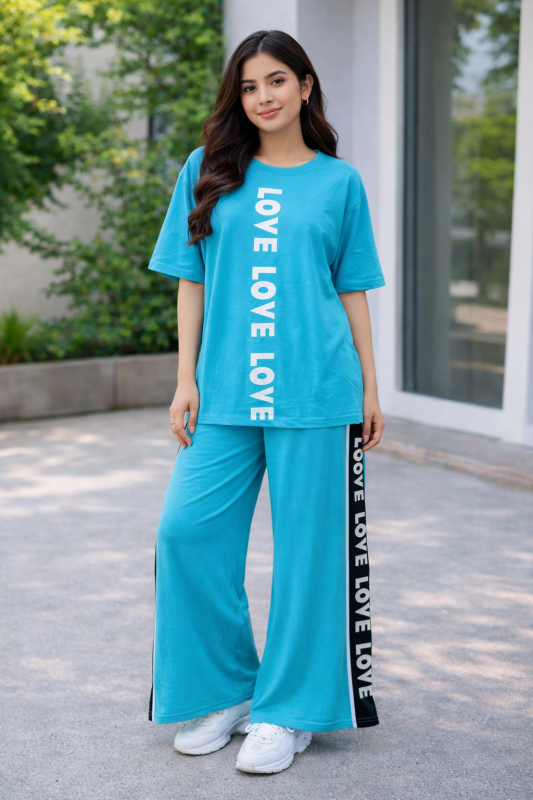 Women’s Premium Drop shoulder T-shirt & pajama Set 2Pcs-Light Blue
