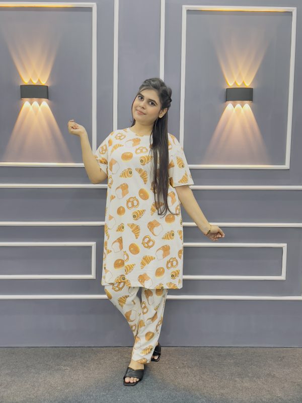 Women’s Premium Long T-shirt & pajama Set 2PCS-Cream
