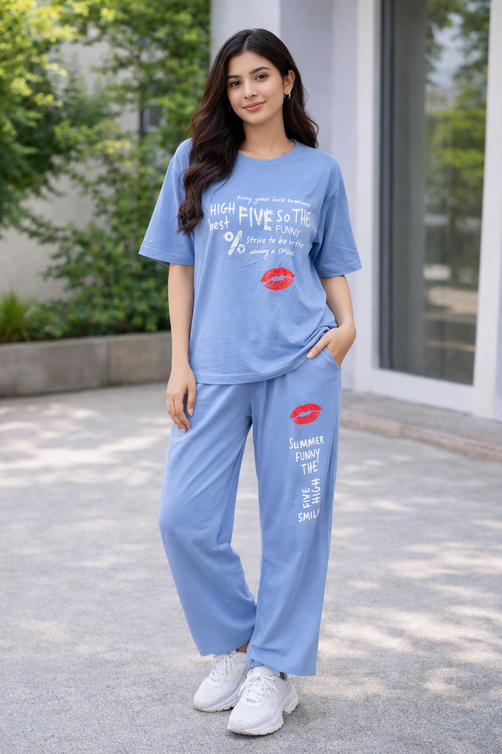 Women’s Premium Drop shoulder T-shirt & pajama Set 2Pcs-Light Blue