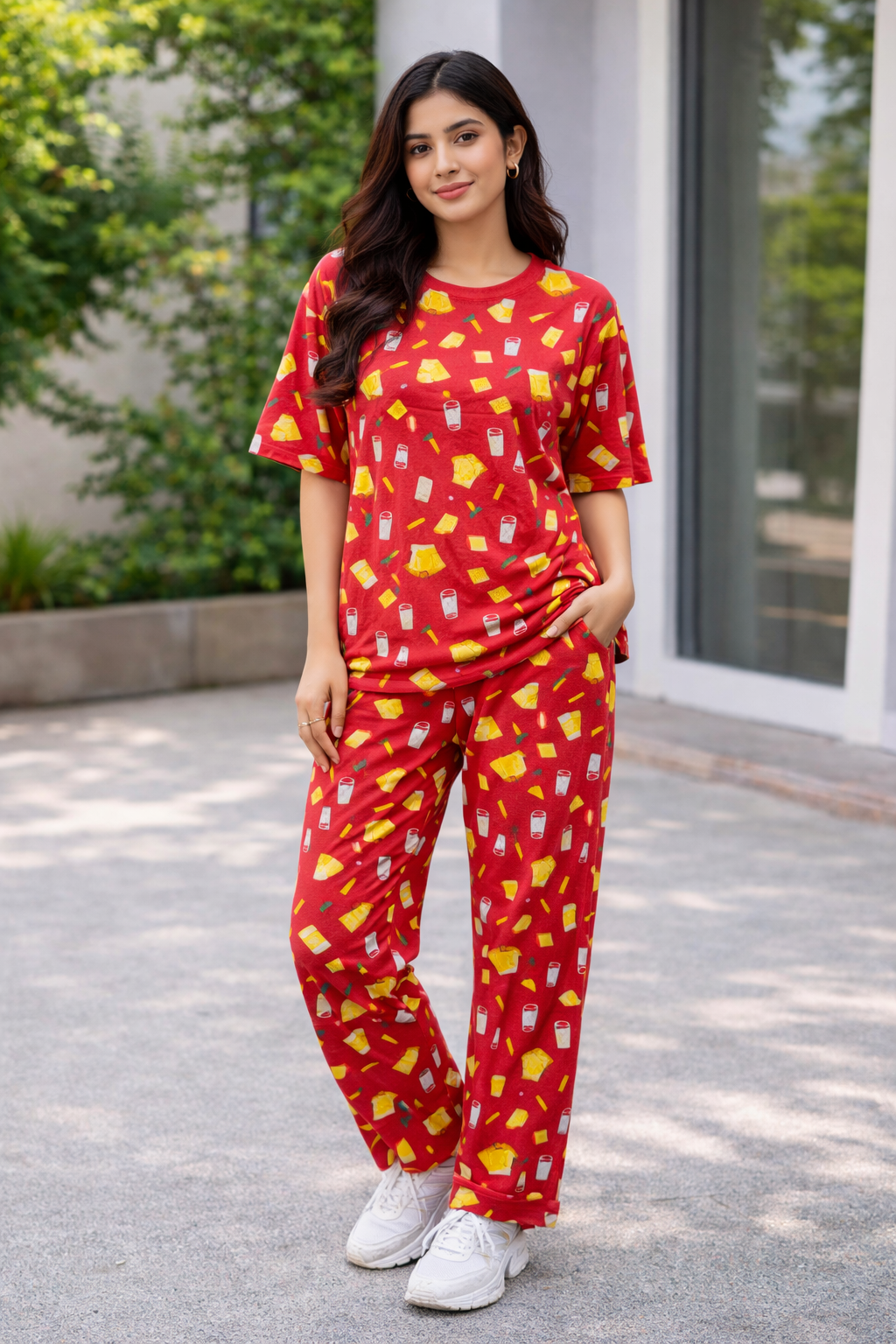 Women’s Premium Drop shoulder T-shirt & pajama Set 2Pcs-Red