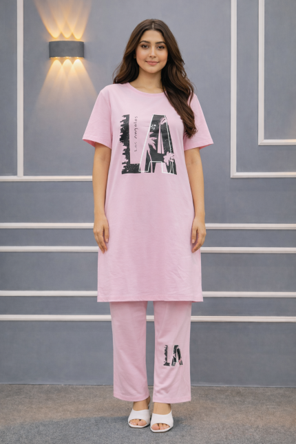 Women’s Premium Long T-shirt & pajama Set 2pc-Light Pink